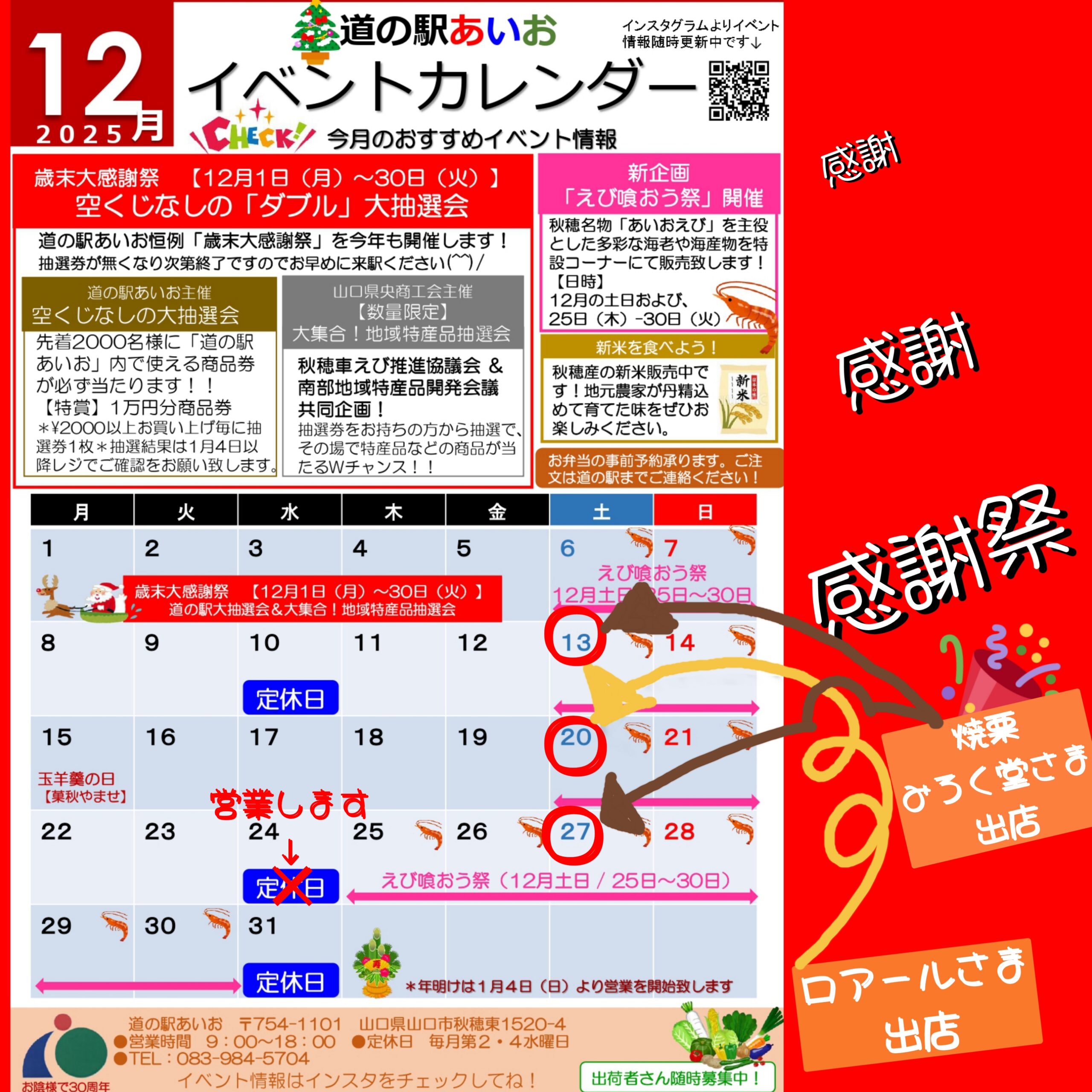 12月イベントカレンダー お知らせ 2025/12/04 12月イベントカレンダーです…… わかりにくくてごめんなさい💦 24日(第四水曜日)は定休日を返上して営業いたします。 20日「ロアール」さま出店 13日、27日「焼栗みろく堂」さま出店 以上が追加情報です。 1日から始まりました「歳末大感謝祭」 おかげさまで盛り上がっております❗ 12月の土日と25日〜30日まで開催する 「えび喰おう祭」の準備も整いました❗ どうぞ「道の駅あいお」までお出かけくださいませ。